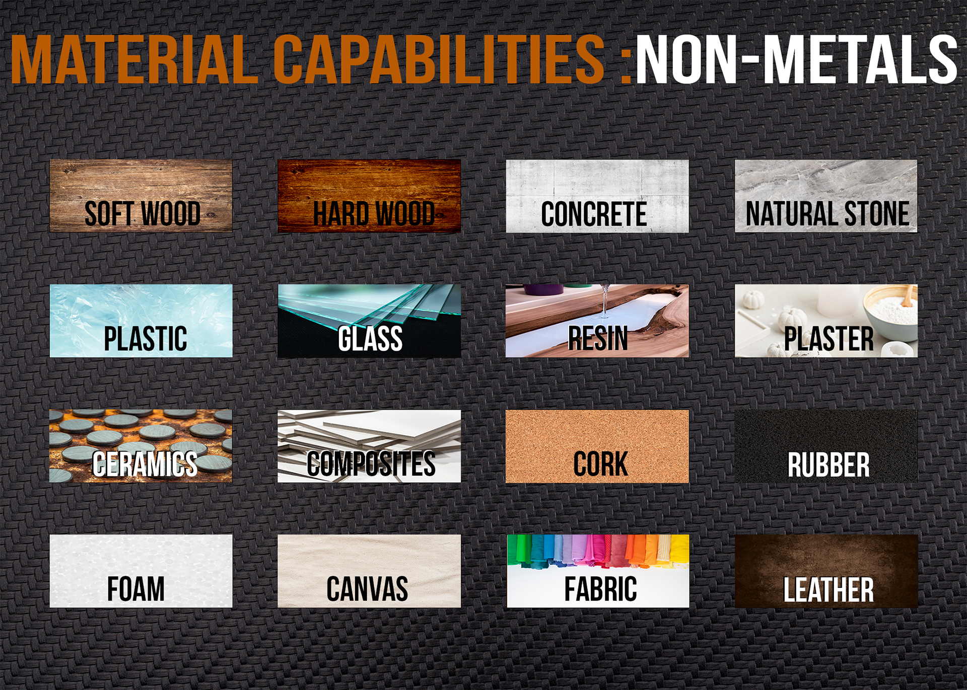 This is a list of the various materials I am capable of working with separated by two categories: metals and non-metals. I am able to weld/braze/machine all of the metals listed, where applicable.